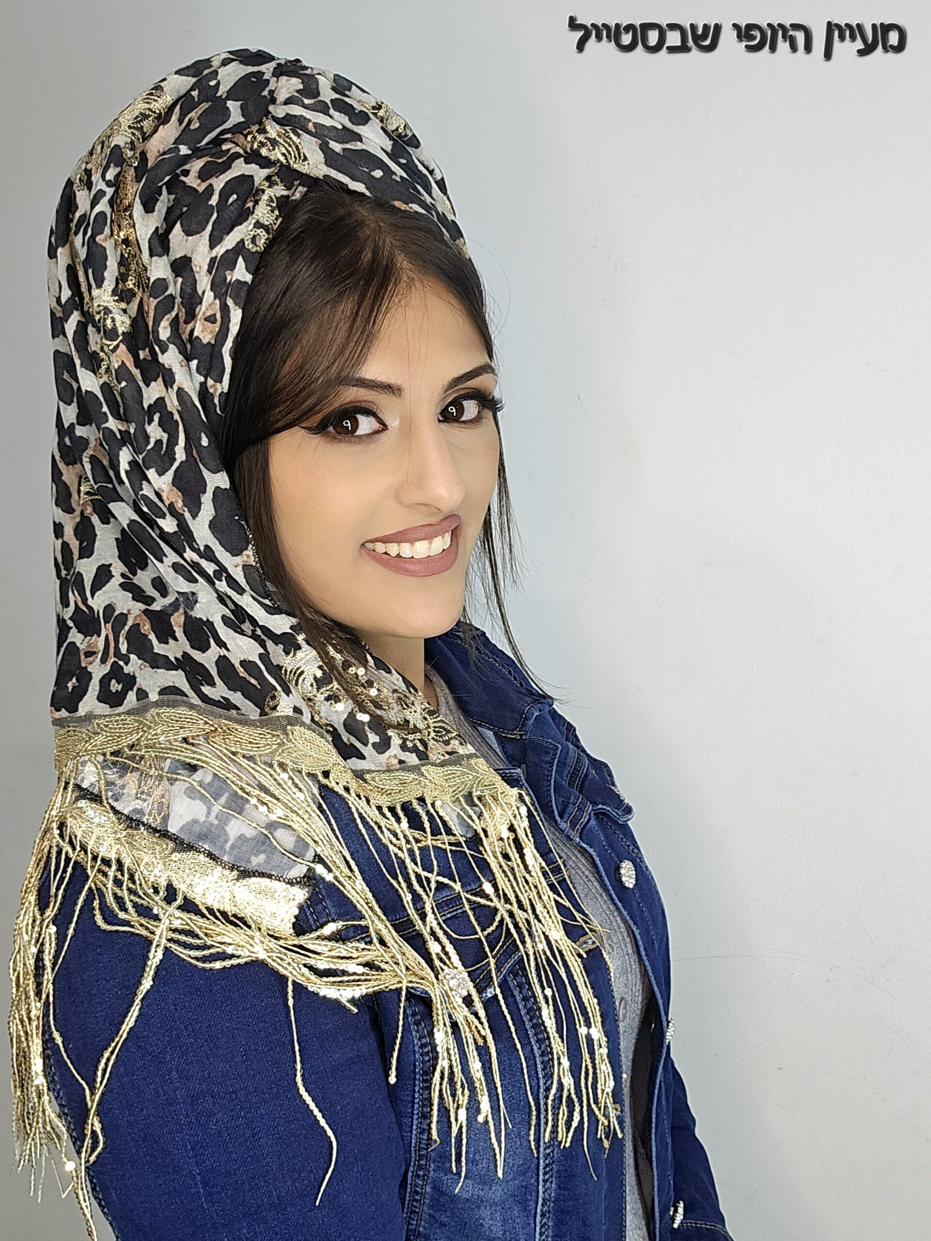 מטפחת נוחה לקשירה מנומר מיוחד ופרנזים בסוף המטפחת . מתאימה לכיסוי מלא וגם לחצי